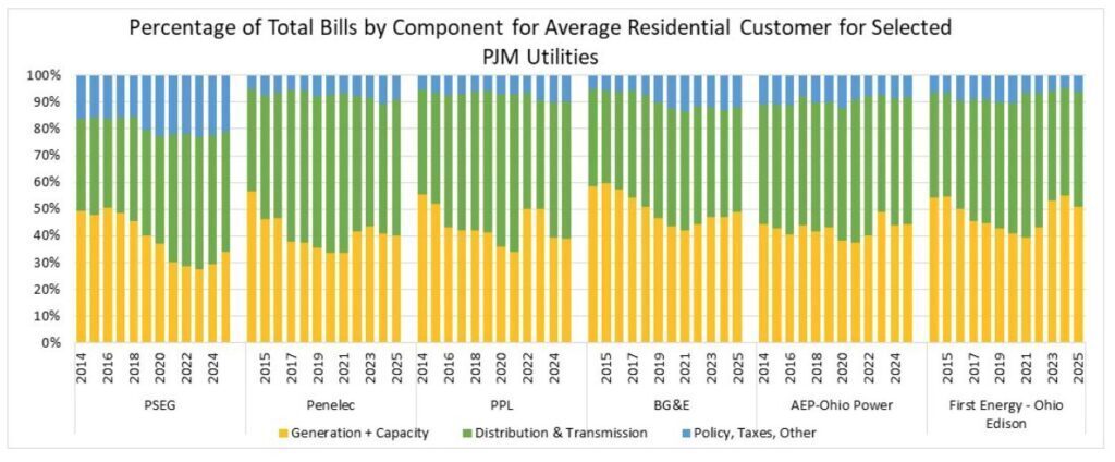 In its analysis of data from Maryland, the study “found that the generation component of residential customer bills has fluctuated over the study period, averaging approximately 48% of the total bill. In 2025, the residential retail cost of generation as a percentage of customer bills has not increased materially and is consistent with historical averages. Transmission and public- policy-related charges have grown in the last decade and consume a greater share of the total residential bill.”