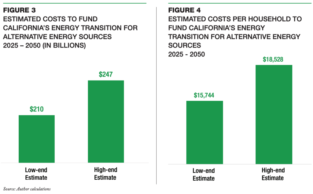 The new April 2025 report by Winegarden and Jackson found that the estimated cost of funding California’s transition between 2025 to 2050 will be between $210 billion and $250 billion. Some costs are explicit, but others are hidden in the higher prices of goods and services that families purchase.