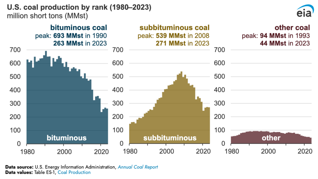 In April 2025, the EIA published an analysis that showed that bituminous coal production actually peaked 35 years ago, and subbituminous peaked 20 years ago, long before 2021, when Paxton claimed the “cartel” allegedly conspired to reduce output.