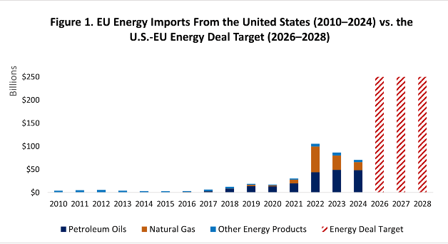 That would be a huge – and potentially unachievable — increase over the status quo. The American Action Forum (AAF), a centrist research and analysis group, noted that the U.S. “exported roughly $70 billion worth of energy products to the EU in 2024, and projected U.S. petroleum and natural gas exports to the bloc are about $207 billion in total for 2026–2028, meaning the EU would have to more than triple its current energy imports from the United States annually to fulfill the target.”