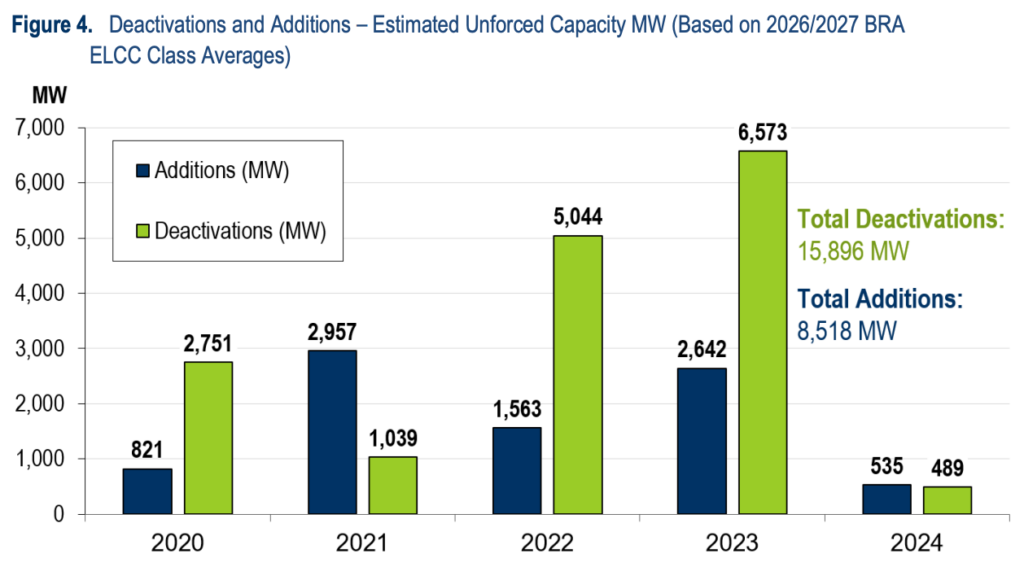 Asthana’s prepared testimony included a bar chart showing that between 2020 and 2024, plant deactivations involved 15,896 MW of capacity while additions amounted to only 8,518 MW.