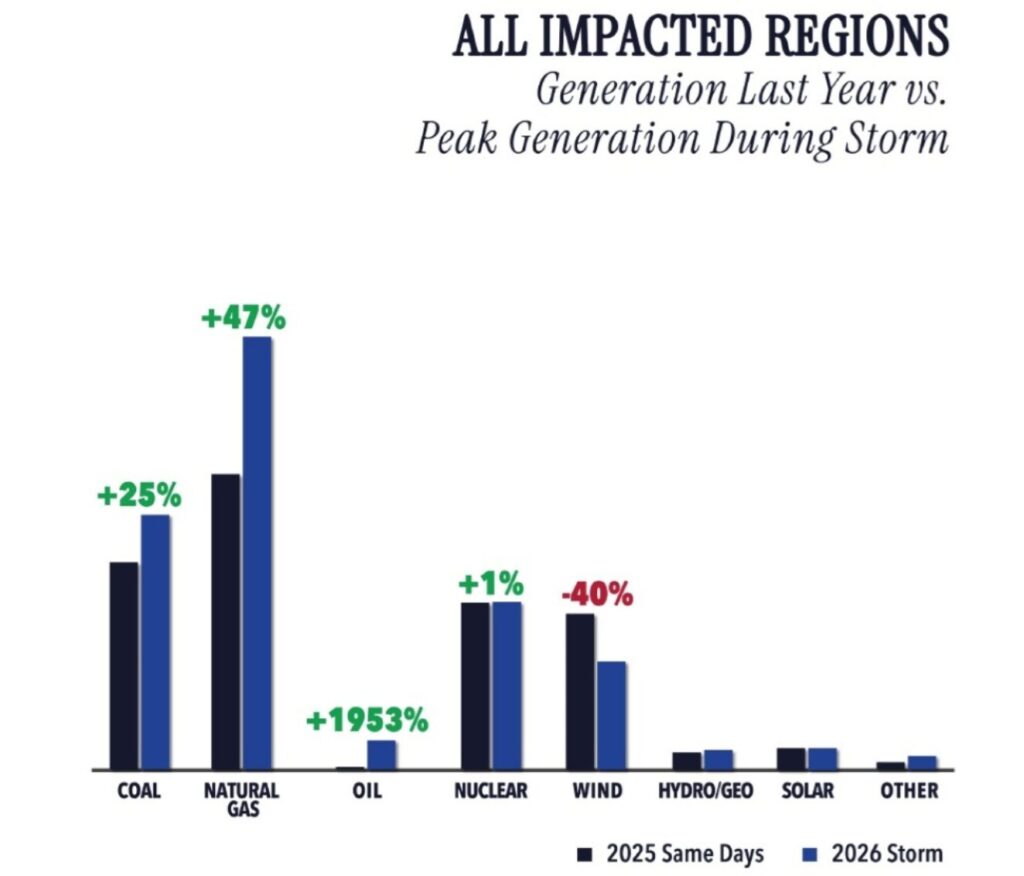 Secretary Wright called coal “the MVP of recent winter storms” – though natural gas was relied upon far more. During the week of Fern, “coal accounted for 21% of all electricity generation in the Lower 48 states,…up from 17% the previous week. Coal was the second-largest source of energy used for electricity, following natural gas, which contributed 38%. Nuclear was third at 18%,” said a Jan. 28 report from the Energy Information Administration.