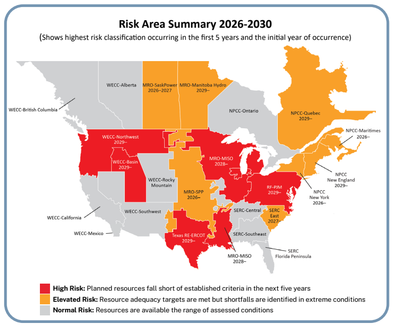 Especially dire is the outlook for 2029 and 2030. The LTRA assesses that the MISO (Midwest) region, PJM (mainly Mid-Atlantic but also parts of the Midwest and South), and West and Northwest regions of the U.S. are all at “high risk” for 2029 and 2030. NERC says that in high-risk areas, “planned resources as of July 2025 would result in energy shortfalls that exceed resource adequacy targets or baseline criteria for unserved energy or loss of load.”